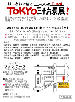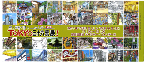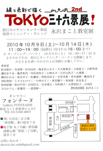 昨年に続いて、TOKYO36景展!2nd が今日から新宿世界堂6F、ギャラリー・フォンテーヌで始まりました。永沢まこと教室の生徒36名がTOKYOを全紙(720×560mm、約20号サイズ)に描くグループ展です。