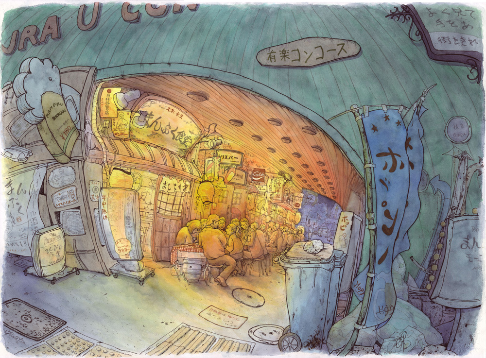 描き始めてからは、「自分の色」と「線の強化」を意識しました。魚眼レンズでのぞいたようなデフォルメにも挑戦。 昨年に比べて、色についてのコメントが減り、デフォルメした形の面白さや、全体の雰囲気についての感想を多くいただき、「線の強化」という目的を少しは果たせたのかなと思います。複数の方に「絵本のよう」と言っていただきましたが、「ゴミと飲み屋ですよ」と返して笑い合いました。絵本には似つかわしくないモチーフであります。
