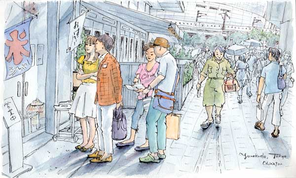 私は有楽町駅前のイトシアにある甘味処「おはぎ」に並ぶ人々と行き交う人々を描きました。