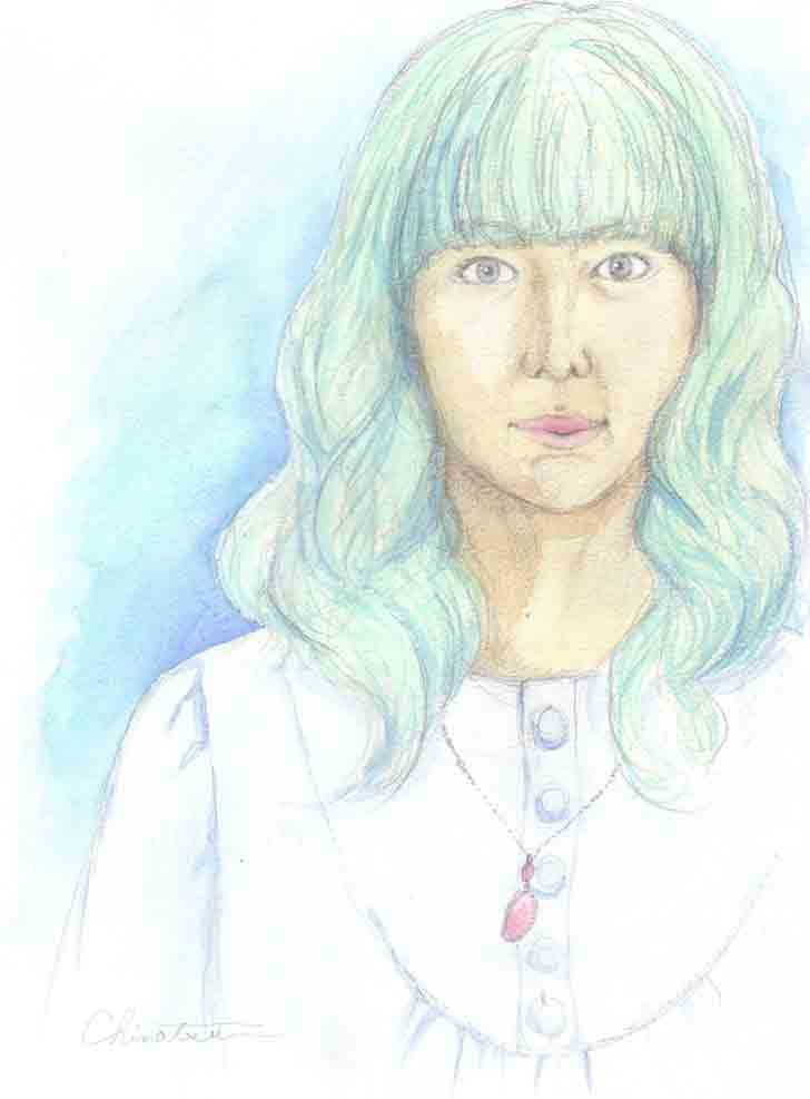 彩色は、リアルにしすぎず好きな色を塗ってみることに。私が普段よく使う色はイエロー、オレンジ、ピンクなどですが、どうしてもこの自画像のイメージには合わず、ブルー系で仕上げてみました。