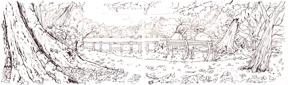 ケヤキの木の根っこと横長に広がる向こう岸が気に入り、この場所を選びました。しばらくすると、かわいらしい親子連れがやってきたので、パノラマに広げて。木々が中心のため、久々に自由にペンが走り、気持ちのいいスケッチでした。
