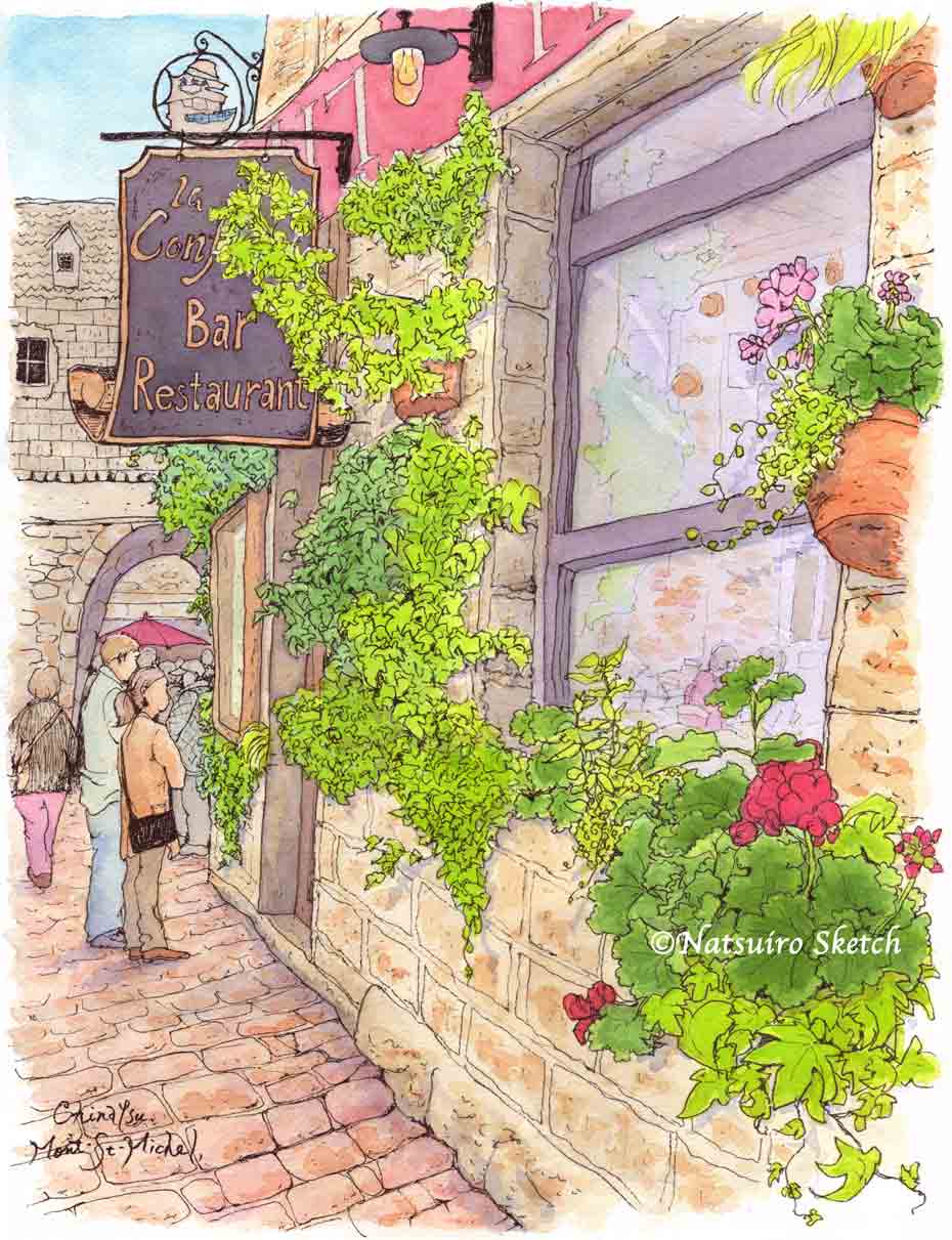 今回は個展の時にスケッチ仲間や先輩と話題になった、自分なりの「ちょうどいい描き込み」を探ってみようと、あえて描き込みをおさえてみました。ついぎっちりと描き込みしちゃうんですよね。彩色は、手前は濃いめに、奥は薄めにと、メリハリを意識して塗ってみました。
