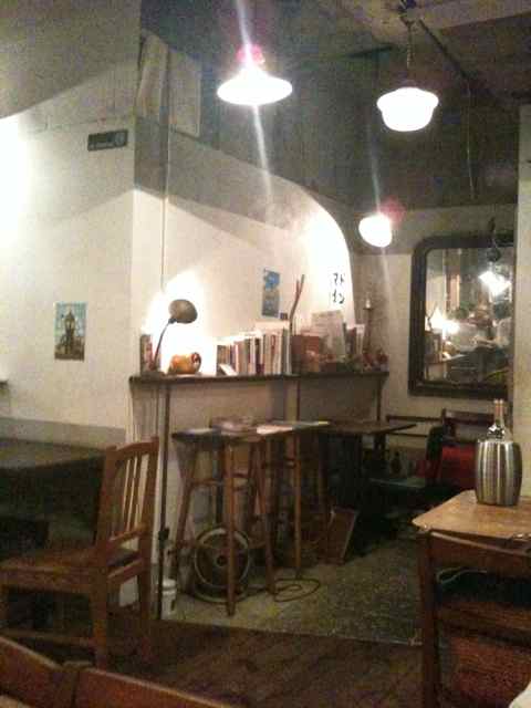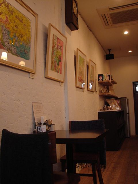 落ち着いた色調の古材を使った家具。白い壁。片側は一面ガラスで自然光も入る。静かなジャズが流れ、紅茶やケーキがおいしい。「個展をやるなら最初は小さなカフェがいいかも」となんとなく思っていた私には理想的な空間でした。次に訪れた時に、勇気を出して店主さんに申し出て、その次に作品をお見せし、展示の承諾を得ました。