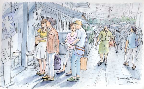 私は有楽町駅前のイトシアにある甘味処「おはぎ」に並ぶ人々と行き交う人々を描きました。