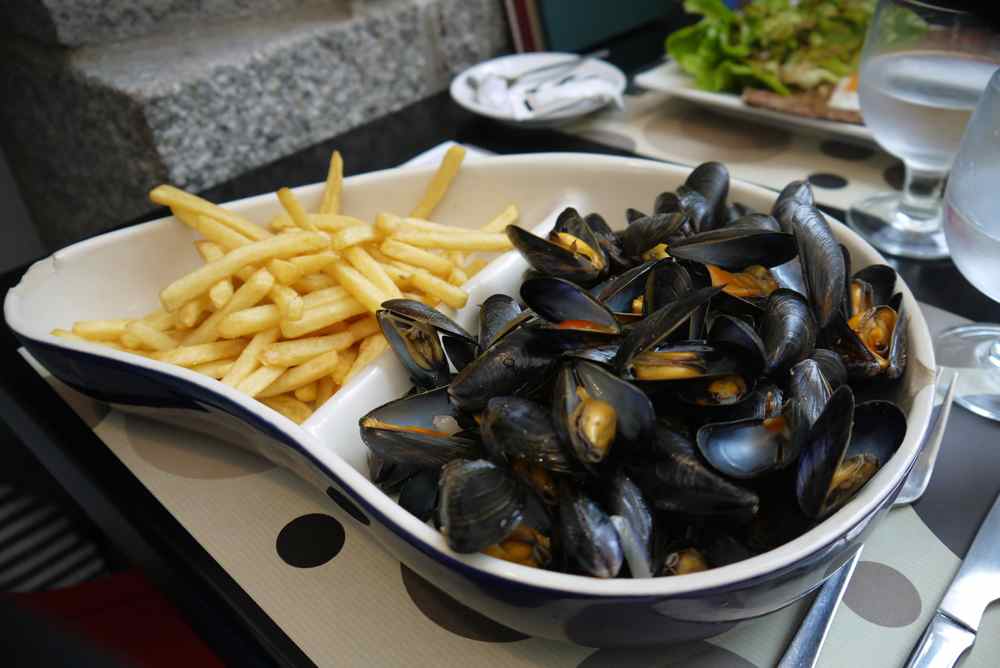 このあたりはムール貝が産物らしく、どこのお店もムール貝のワイン蒸しを看板メニューにかかげています。一緒にランチした仲間が注文したので、少し分けてもらいました。日本で食べるムール貝は巨大で苦手ですが、これは小ぶりでワインが効いていて、いくらでも食べられます。